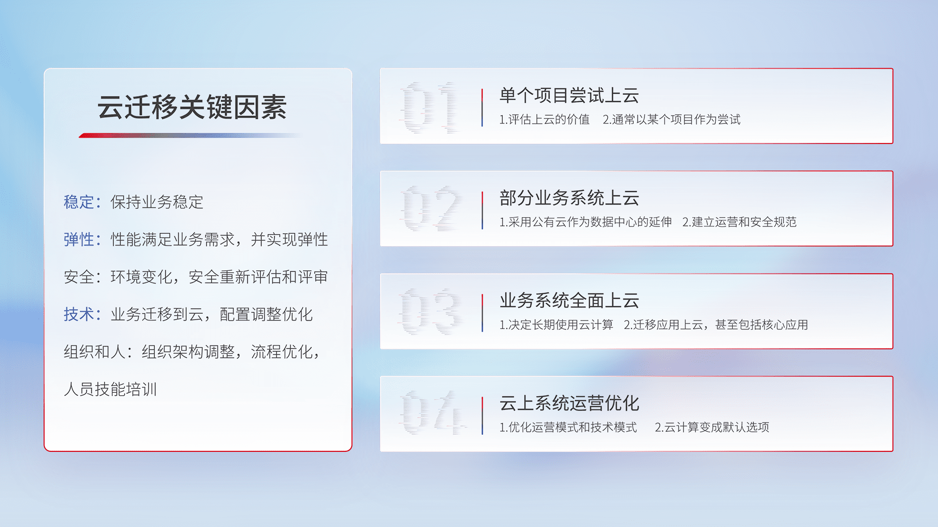 结合实际业务,,,,从规划设计、、、云平台选型、、、、云原生改造、、、数据迁移、、集成交付,,,,迁移全过程为客户识别最佳上云路径,,,做好风险识别管理,,设计网络架构、、、身份权限、、、、安全审计合规、、、操作审计、、、、日志审计、、监控告警策略、、、多站点容灾设计等,,,对云上基础设施进行整体规划,,提升IT治理水平,,,,以满足弹性、、、高可用、、高性能的需求。。。。