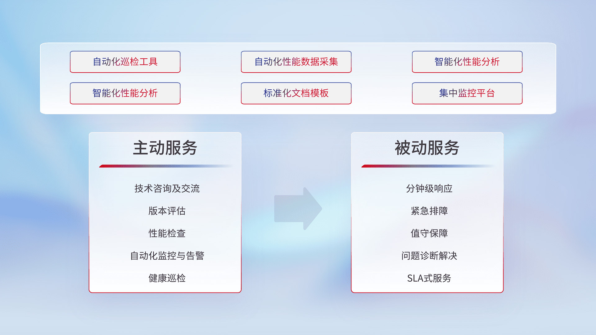 智能化工具和标准化文档,,,保障服务质量,,,,提供主动服务(包含技术咨询、、、、版本评估、、、、性能检查、、、、自动化监控与告警、、健康巡检)和被动服务包含(分钟级响应、、、紧急排障、、、值守保障、、、、问题诊断解决、、、、SLA服务)。。